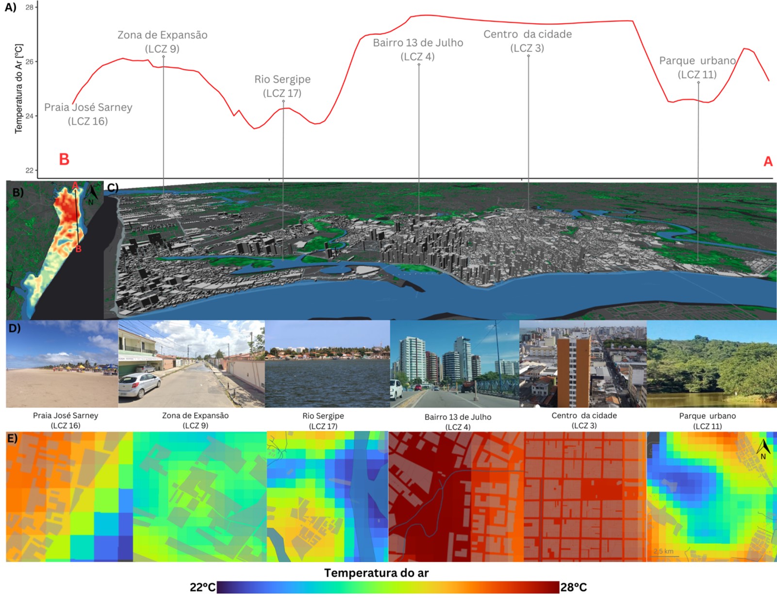 (A) Perfil de temperatura do ar (°C) ao longo dos segmentos A e B em Aracaju (SE), extraído do mapa de temperatura interpolada (B), referente ao dia 18 de fevereiro de 2016 às 08:00h. (C) Morfologia urbana representada por edifícios em 3D. (D) Imagens de satélite e suas respectivas classes de LCZ, indicando os diferentes usos e cobertura do solo. (E) Recorte da distribuição espacial em 2D da temperatura do ar, com valores extraídos do mapa de temperatura (B), para cada imagem de satélite. Autores: Anjos et al. 2026